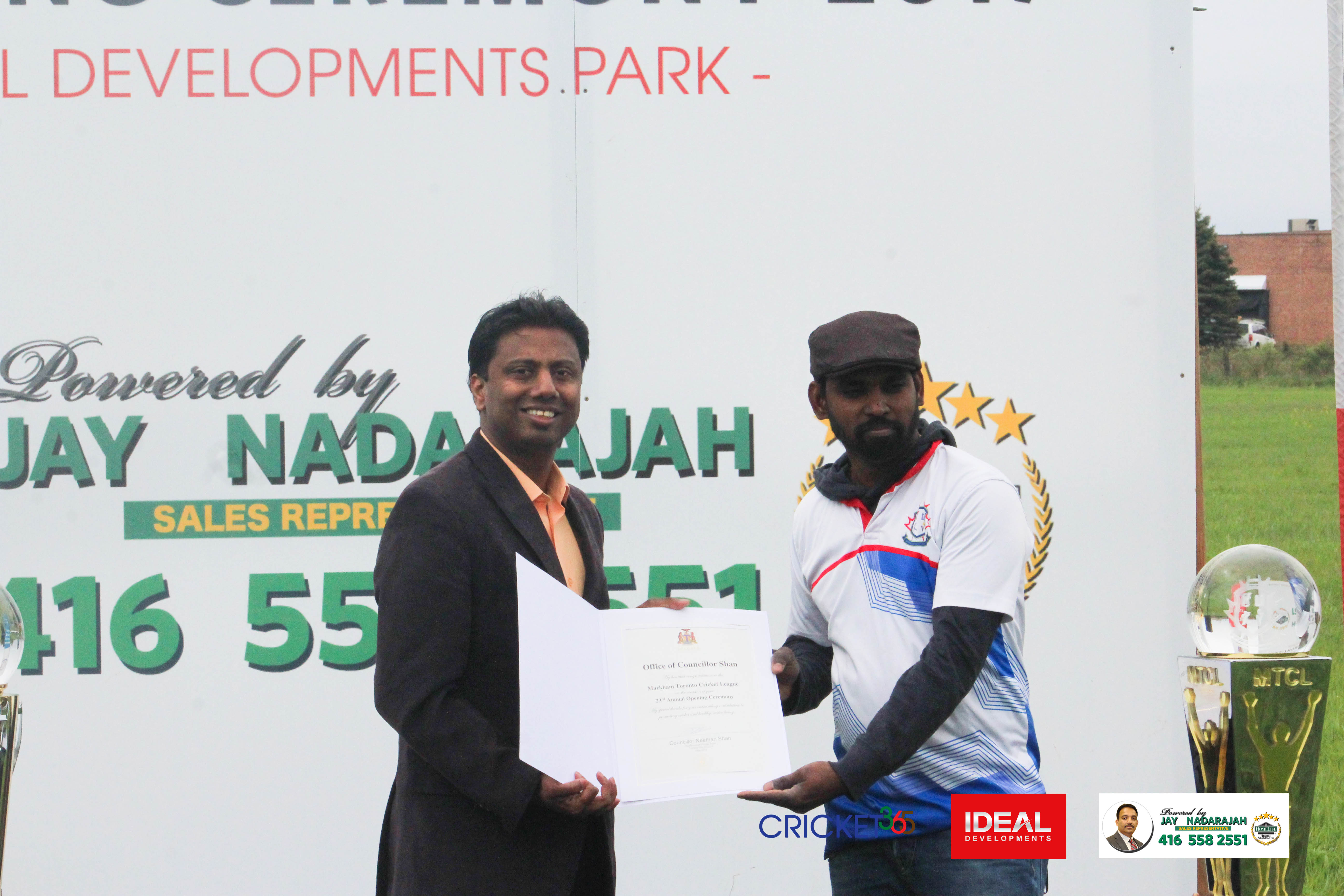 மார்க்கம் ரொறொன்டோ கிரிக்கெட் லீக்(MTCL) அமைப்பின் 23வது வருட கோடை கால மென்பந்து துடுப்பாட்ட போட்டிகளின் ஆரம்ப நிகழ்வு கடந்த 21ம் திகதி ஞாயிற்றுக்கிழமை (May 21st) அன்று ஐடியல் டெவெலொப்மெண்ட் பார்க்(IDEAL DEVELOPMENT PARK )மைதானத்தில் மிகவும் விமர்சையாக நடந்து முடிந்தது. இந்நிகழ்ச்சிக்கு மெகா பைனான்சியல் காப்புறுதி முகவர்(Mega Financial Insurance Broker) ஜெய் நடராஜா(JAY NADARAJAH) பிரதான அனுசரணை வழங்கியிருந்தமை குறிப்பிடத்தக்க விடயமாகும். இந்த நிகழ்ச்சியானது கனடா நாட்டின் கொடியேற்றல் மற்றும் கனடா நாட்டு தேசியகீதம் இசைத்தலுடன் ஆரம்பமானது.
