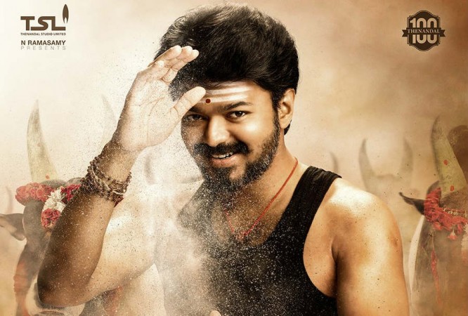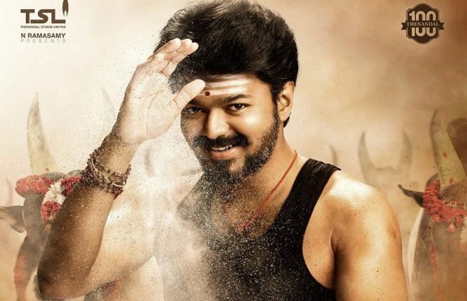 காளைமாடு பின்னணியில் இருக்க கலக்கலான போஸ் கொடுத்துள்ளார் விஜய். படத்தின் பெயர் கூட மாட்டின் வால் போல டிசைன் செய்யப்பட்டுள்ளது. இதில் விஜய் காளையை அடக்கும் வீரராக நடித்திருக்கலாம்.